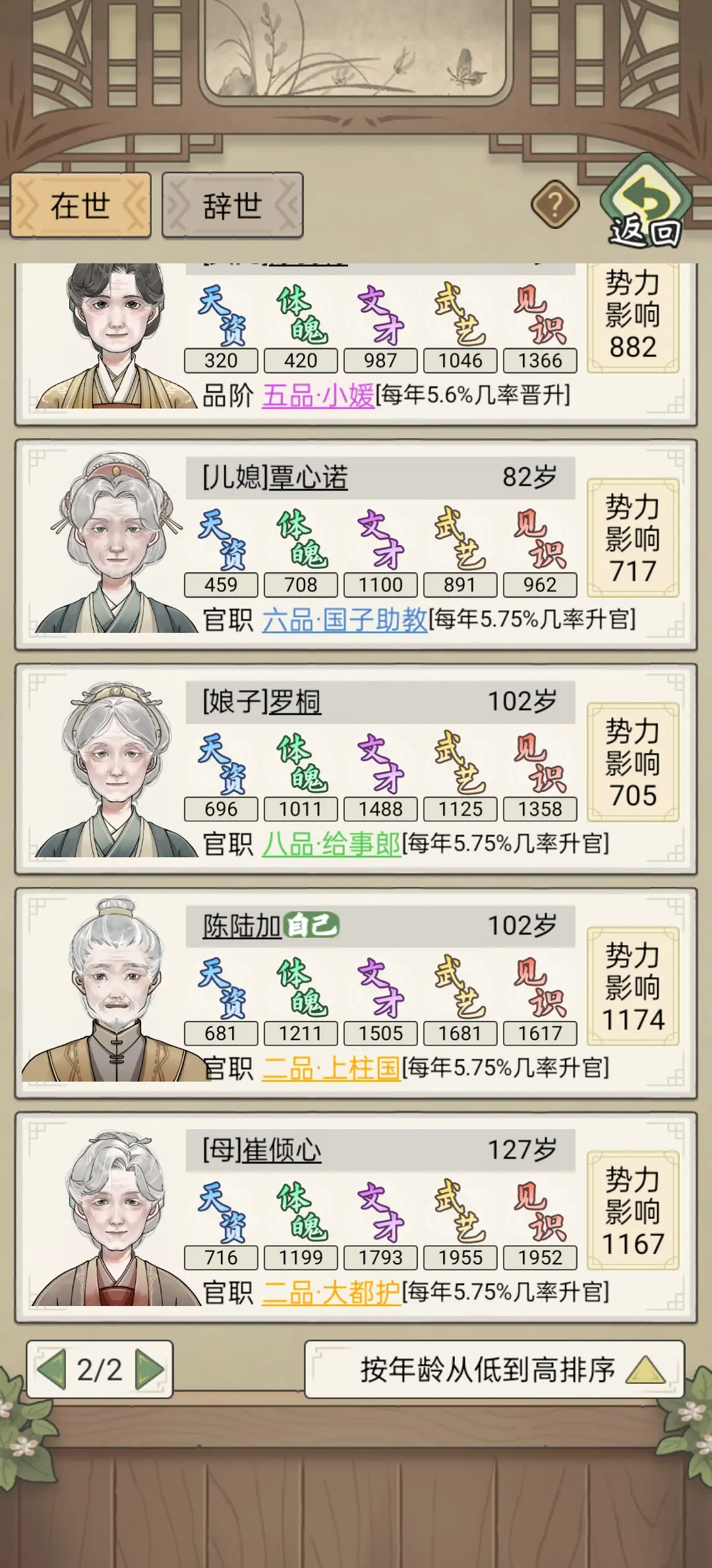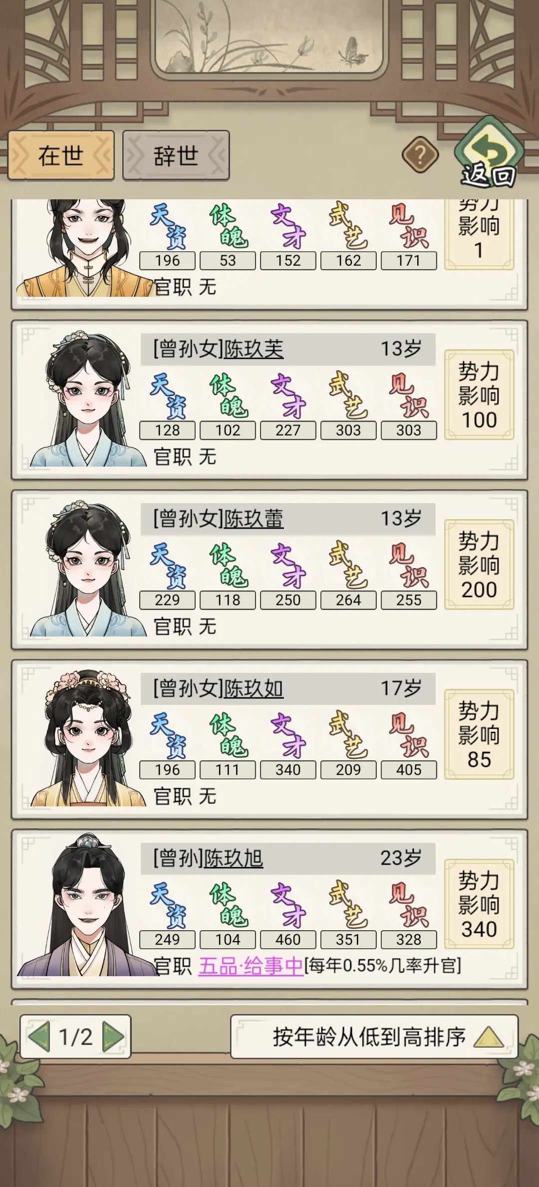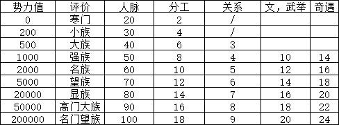4、入仕或从军:若文才与谋略之和,或者武艺与体魄之和达到200点及以上,便可选择入仕或者从军。每次晋升官职,能够增加势力,势力最多可增加500点。需留意的是,到66岁时会退休,届时因升官所增加的势力将会被扣除。