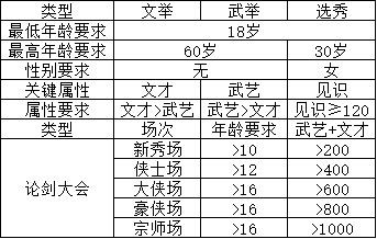 选秀条件:年龄需满足18≤年龄≤30(若成年年龄为20,则最低年龄为20),每五年举办一次选秀。人物成年之后,无需急于马上参加选秀,可先积累一些见识值再参与,年龄对选秀评级似乎并无影响。