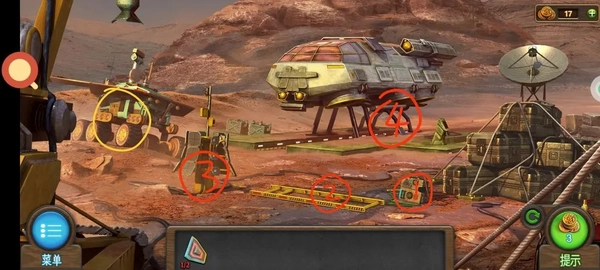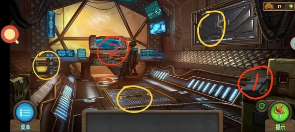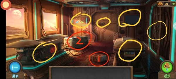 返回场景3,红圈处使用钥匙,完成小游戏,得到:①电池,②零件2。