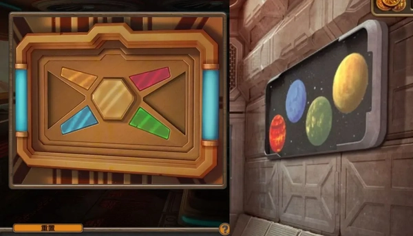 ❷在红圈标注的2处,依据星球给出的提示,按照红蓝绿黄的颜色顺序进行点击(点击完成后,不要忘记点击中间位置),之后可获得:①管子,②零件。