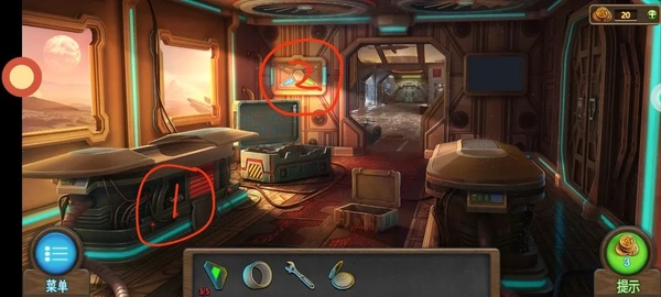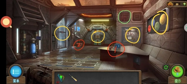 来到场景2,在红圈位置,首先使用访问卡,接着完成随机刷新的小游戏,之后再使用胶带和氧气球,便能获得以下物品:①5个绿零件,②1个红零件,③太空服。