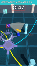 2、游戏中关注上方时间,跟着箭头指引移动,遇到别的角色要小心,利用场景建筑藏好自己,别被抓到呀。