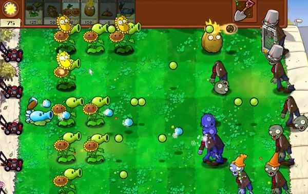 3、前期优先用豌豆和向日葵布阵,等拥有足够火力后,就需要开始建造坚果了。