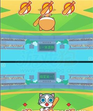 游戏中的主角是非常可爱的喵星人,它们有着大大的眼睛,整个脑袋比身体还大,很明显的夸张类卡通绘画方式。游戏采用了相对反向的画面呈现,我们的屏幕分为两个区域,上下各为不同的区域,相互反向,这样刚好两个人就能对面而坐。游戏画面风格非常清新秀气,再加上可爱的喵星人会有各种不同的表情,让残酷的挑战也变得充满了搞怪的趣味。