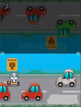 3、这一关还是比较简单的,玩家们只要点击屏幕就可以改变角色的前进道路,这样的话我们不断地注意前方的车辆道路,来让角色避开那些车辆不断地前进就可以了
