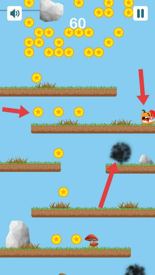 2、游戏中南瓜角色在多层平台间移动,收集金币,同时要避开黑色烟雾等障碍,持续前进,积累分数。