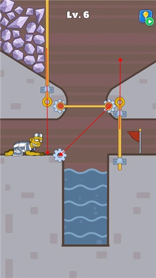 5、来到第六关,首先解开中间的横杆,接着让上面的石块掉落,使其堵住水池,如此便能够顺利通关。