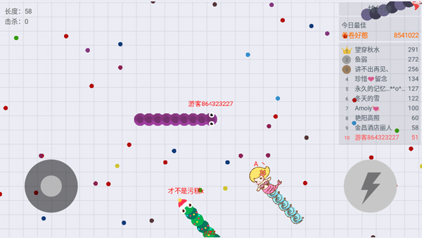 当然啦,你必须确保自己操控的蛇头,不会碰到其他玩家控制的蛇身,这对咱们的反应能力可是个不小的考验。此外,为了让大家玩得更尽兴,贪吃蛇大作战专门设置了一个加速技能。在对手毫无防备之时,加速冲到对方的必经之路,就能以弱胜强,轻松击败比自己庞大的对手。这种感觉是不是超刺激?别再犹豫啦,赶紧下载体验一番吧!